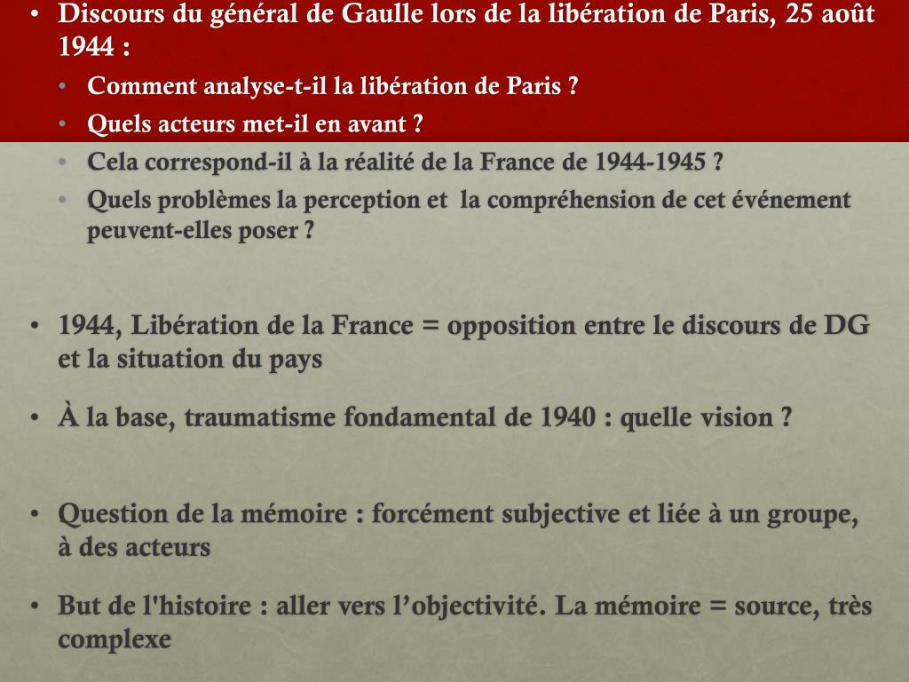 Discours du général de Gaulle lors de la libération de Paris, 25 août 1944 : • Comment analyse-t-il la libération de Paris ? • Quels acteurs met-il en avant ? • Cela correspond-il à la réalité de la France de 1944-1945 ? • Quels problèmes la perception et la compréhension de cet événement peuvent-elles poser ? • 1944, Libération de la France = opposition entre le discours de DG et la situation du pays • À la base, traumatisme fondamental de 1940 : quelle vision ? • Question de la mémoire : forcément subjective et liée à un groupe, à des acteurs • But de l'histoire : aller vers l’objectivité. La mémoire = source, très complexe