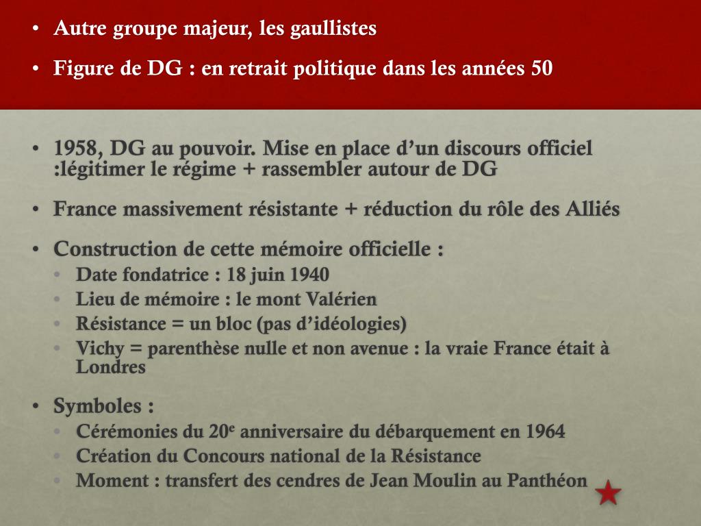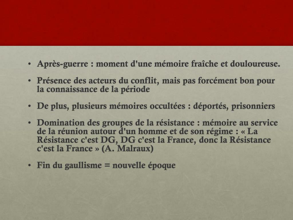 Après-guerre : moment d'une mémoire fraîche et douloureuse. • Présence des acteurs du conflit, mais pas forcément bon pour la connaissance de la période • De plus, plusieurs mémoires occultées : déportés, prisonniers • Domination des groupes de la résistance : mémoire au service de la réunion autour d'un homme et de son régime : « La Résistance c'est DG, DG c'est la France, donc la Résistance c'est la France » (A. Malraux) • Fin du gaullisme = nouvelle époque