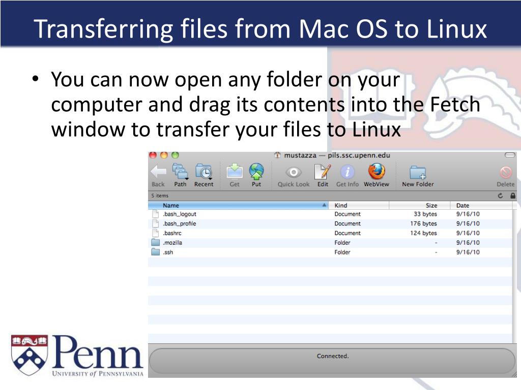 Transferring files from Mac to Linux After you install and open Fetch: • Hostname: pils.ssc.upenn.edu • Username: your PennKey username • Password: you Linux password • Click “Connect”