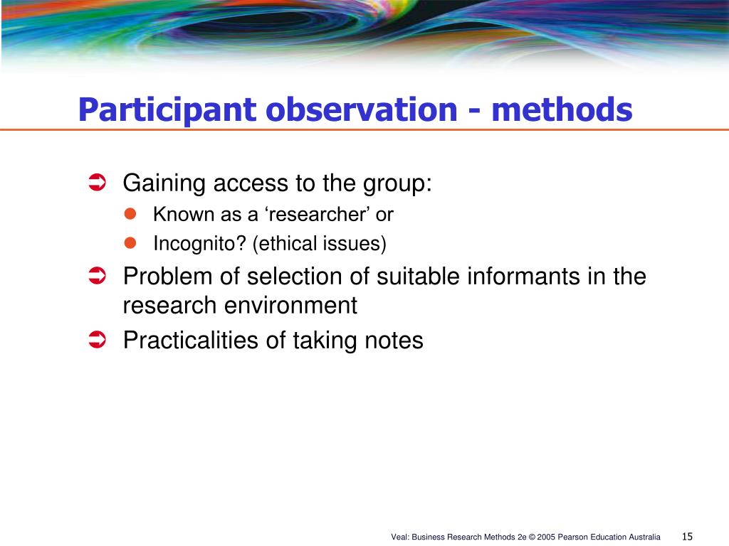 Participant observation - methods • Gaining access to the group: • Known as a ‘researcher’ or • Incognito? (ethical issues) • Problem of selection of suitable informants in the research environment • Practicalities of taking notes