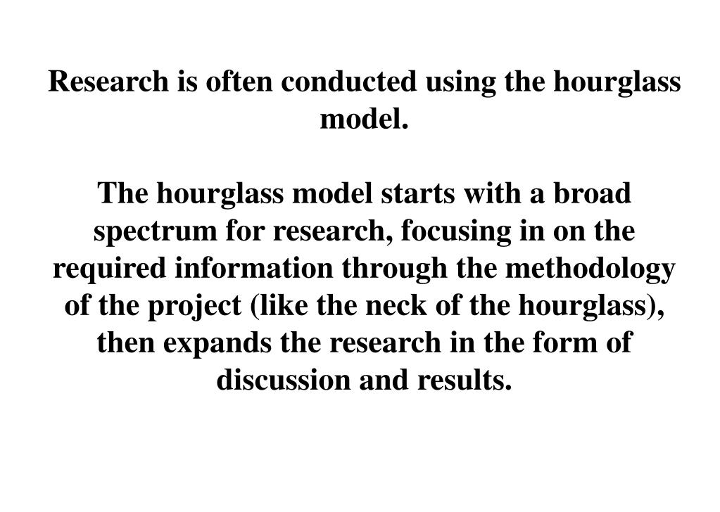 Research is often conducted using the hourglass model. The hourglass model starts with a broad spectrum for research, focusing in on the required information through the methodology of the project (like the neck of the hourglass), then expands the research in the form of discussion and results.