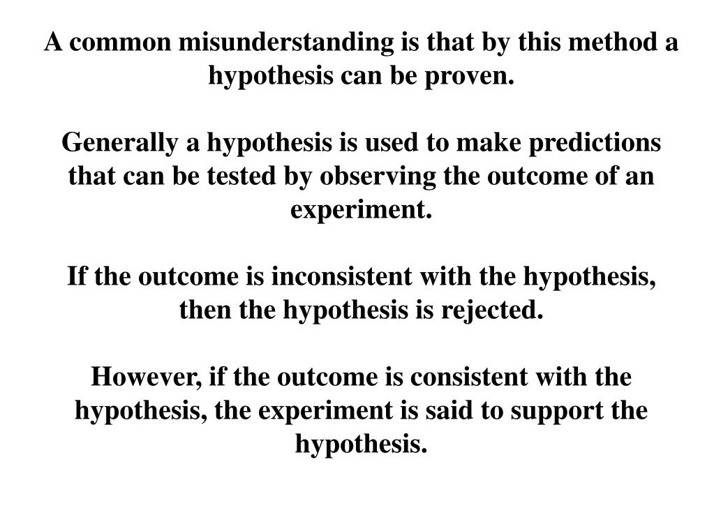 A common misunderstanding is that by this method a hypothesis can be proven. Generally a hypothesis is used to make predictions that can be tested by observing the outcome of an experiment. If the outcome is inconsistent with the hypothesis, then the hypothesis is rejected. However, if the outcome is consistent with the hypothesis, the experiment is said to support the hypothesis.