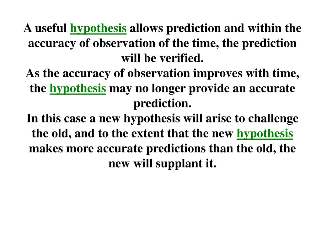 A useful hypothesis allows prediction and within the accuracy of observation of the time, the prediction will be verified. As the accuracy of observation improves with time, the hypothesis may no longer provide an accurate prediction. In this case a new hypothesis will arise to challenge the old, and to the extent that the new hypothesis makes more accurate predictions than the old, the new will supplant it.