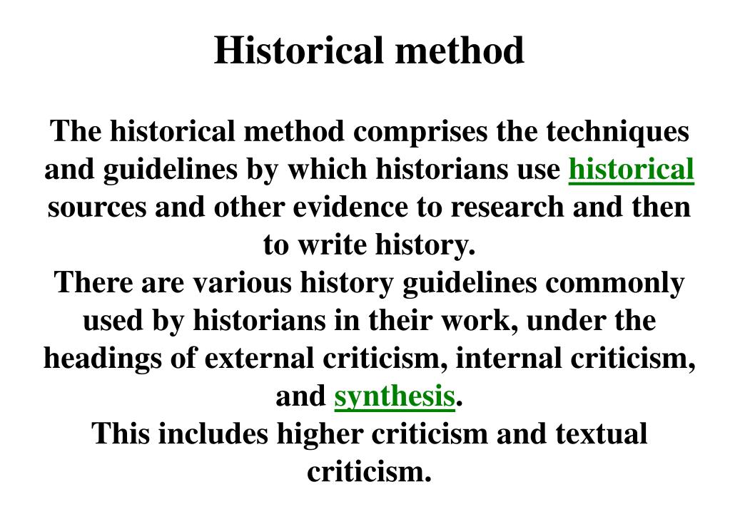Historical method The historical method comprises the techniques and guidelines by which historians use historical sources and other evidence to research and then to write history. There are various history guidelines commonly used by historians in their work, under the headings of external criticism, internal criticism, and synthesis. This includes higher criticism and textual criticism.
