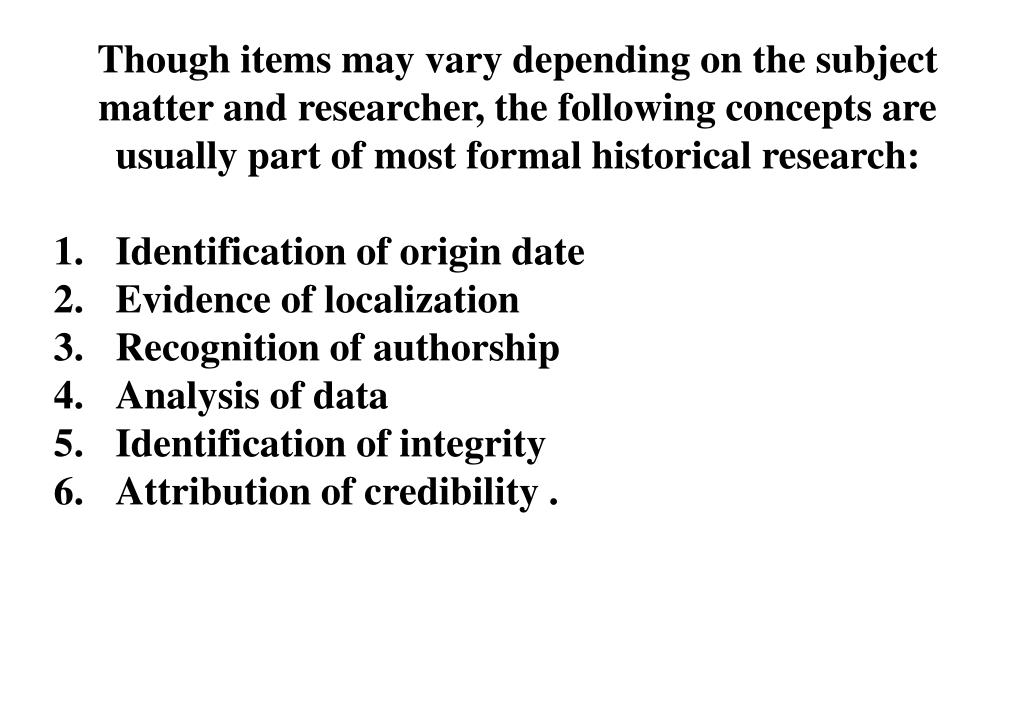 Though items may vary depending on the subject matter and researcher, the following concepts are usually part of most formal historical research: Identification of origin date Evidence of localization Recognition of authorship Analysis of data Identification of integrity Attribution of credibility .