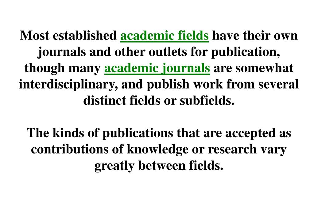 Most established academic fields have their own journals and other outlets for publication, though many academic journals are somewhat interdisciplinary, and publish work from several distinct fields or subfields. The kinds of publications that are accepted as contributions of knowledge or research vary greatly between fields.