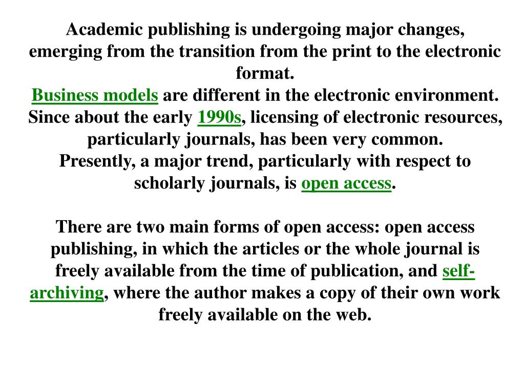 Academic publishing is undergoing major changes, emerging from the transition from the print to the electronic format. Business models are different in the electronic environment. Since about the early 1990s, licensing of electronic resources, particularly journals, has been very common. Presently, a major trend, particularly with respect to scholarly journals, is open access. There are two main forms of open access: open access publishing, in which the articles or the whole journal is freely available from the time of publication, and self-archiving, where the author makes a copy of their own work freely available on the web.
