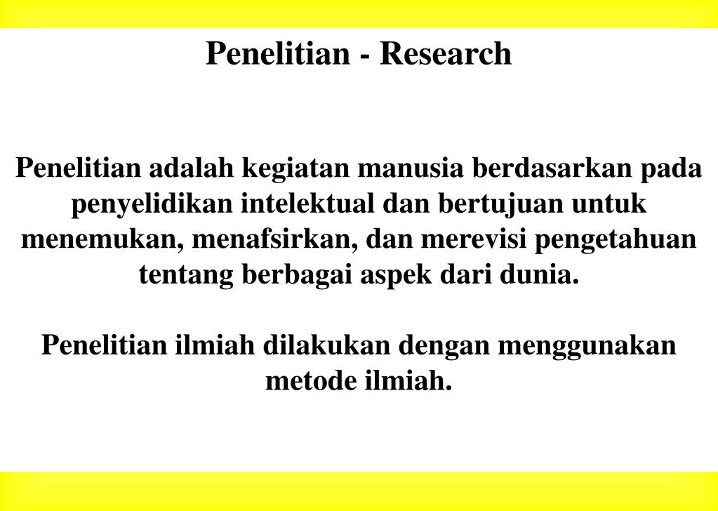 Penelitian - Research Penelitian adalah kegiatan manusia berdasarkanpada penyelidikan intelektual dan bertujuan untuk menemukan, menafsirkan, dan merevisi pengetahuan tentangberbagaiaspek dari dunia. Penelitian ilmiahdilakukandenganmenggunakan metode ilmiah.