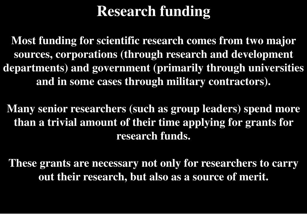 Research funding Most funding for scientific research comes from two major sources, corporations (through research and development departments) and government (primarily through universities and in some cases through military contractors). Many senior researchers (such as group leaders) spend more than a trivial amount of their time applying for grants for research funds. These grants are necessary not only for researchers to carry out their research, but also as a source of merit.