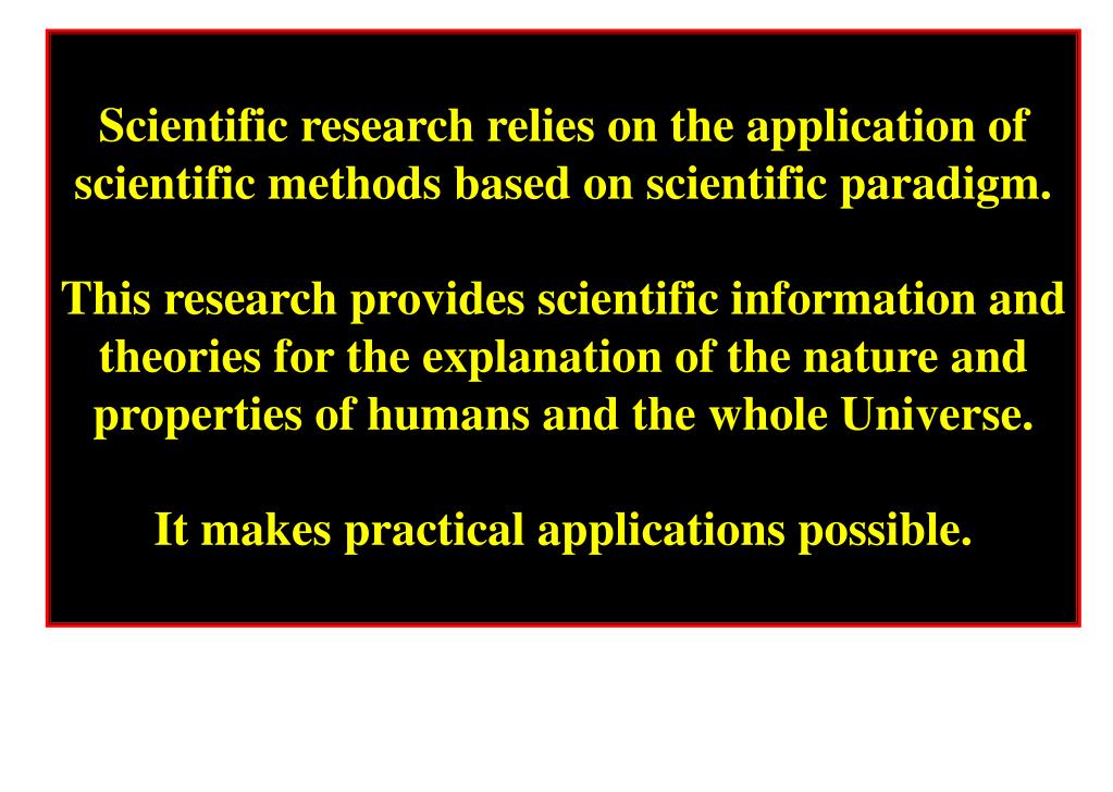Scientific research relies on the application of scientific methods based on scientific paradigm. This research provides scientific information and theories for the explanation of the nature and properties of humans and the whole Universe. It makes practical applications possible.
