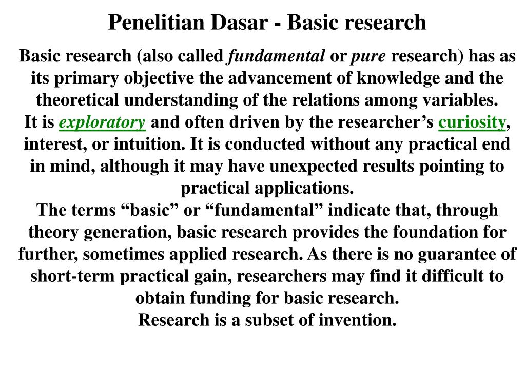 Penelitian Dasar - Basic research Basic research (also called fundamental or pure research) has as its primary objective the advancement of knowledge and the theoretical understanding of the relations among variables. It is exploratory and often driven by the researcher’s curiosity, interest, or intuition. It is conducted without any practical end in mind, although it may have unexpected results pointing to practical applications. The terms “basic” or “fundamental” indicate that, through theory generation, basic research provides the foundation for further, sometimes applied research. As there is no guarantee of short-term practical gain, researchers may find it difficult to obtain funding for basic research. Research is a subset of invention.