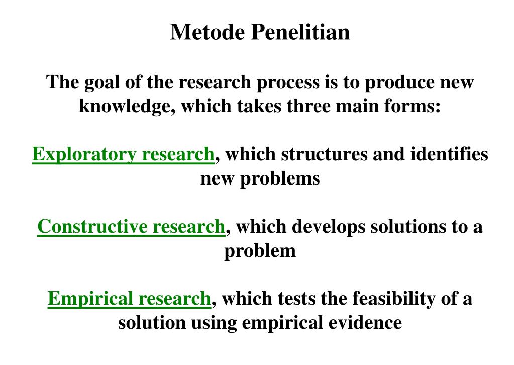 Metode Penelitian The goal of the research process is to produce new knowledge, which takes three main forms: Exploratory research, which structures and identifies new problems Constructive research, which develops solutions to a problem Empirical research, which tests the feasibility of a solution using empirical evidence