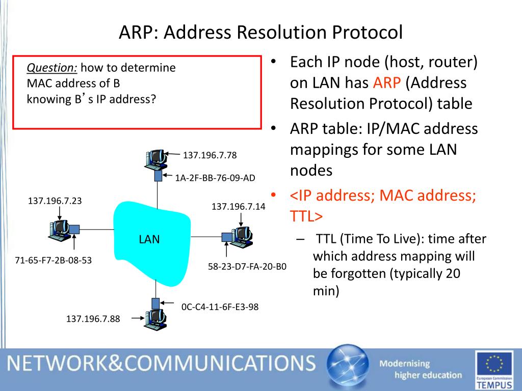 Question: how to determine MAC address of B knowing B’s IP address? ARP: Address Resolution Protocol • Each IP node (host, router) on LAN has ARP (Address Resolution Protocol) table • ARP table: IP/MAC address mappings for some LAN nodes • <IP address; MAC address; TTL> • TTL (Time To Live): time after which address mapping will be forgotten (typically 20 min) 137.196.7.78 1A-2F-BB-76-09-AD 137.196.7.23 137.196.7.14 LAN 71-65-F7-2B-08-53 58-23-D7-FA-20-B0 0C-C4-11-6F-E3-98 137.196.7.88
