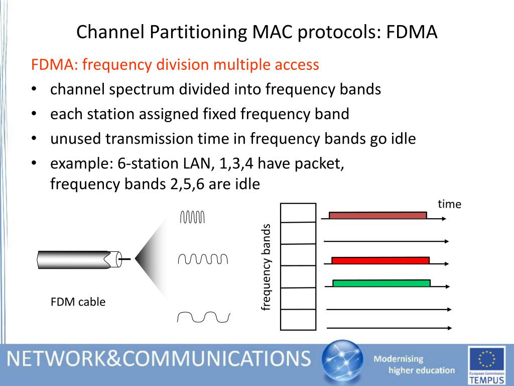 Channel Partitioning MAC protocols: FDMA FDMA: frequency division multiple access • channel spectrum divided into frequency bands • each station assigned fixed frequency band • unused transmission time in frequency bands go idle • example: 6-station LAN, 1,3,4 have packet, frequency bands 2,5,6 are idle time frequency bands FDM cable