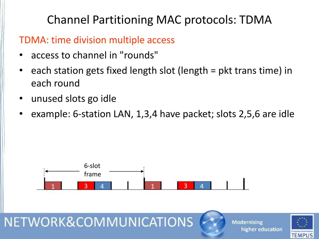 Channel Partitioning MAC protocols: TDMA TDMA: time division multiple access • access to channel in "rounds" • each station gets fixed length slot (length = pkt trans time) in each round • unused slots go idle • example: 6-station LAN, 1,3,4 have packet; slots 2,5,6 are idle 6-slot frame 3 3 4 4 1 1