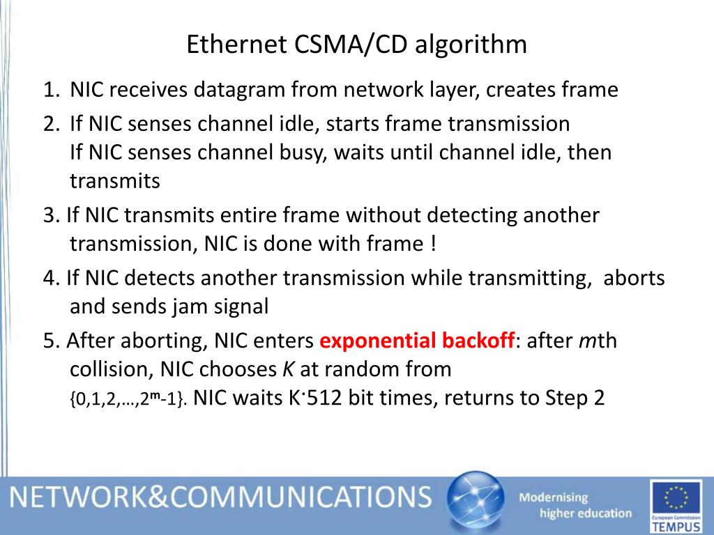 Ethernet CSMA/CD algorithm 1. NIC receives datagram from network layer, creates frame 2. If NIC senses channel idle, starts frame transmission If NIC senses channel busy, waits until channel idle, then transmits 3. If NIC transmits entire frame without detecting another transmission, NIC is done with frame ! 4. If NIC detects another transmission while transmitting, aborts and sends jam signal 5. After aborting, NIC enters exponential backoff: after mth collision, NIC chooses K at random from {0,1,2,…,2m-1}. NIC waits K·512 bit times, returns to Step 2