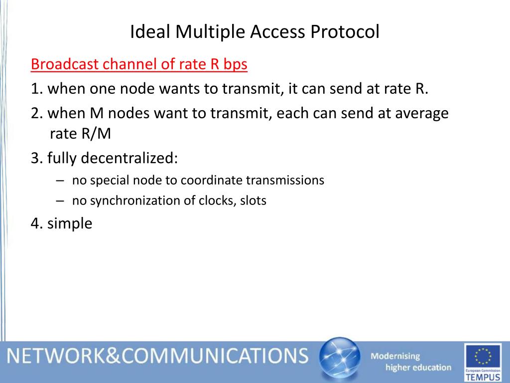 Ideal Multiple Access Protocol Broadcast channel of rate R bps 1. when one node wants to transmit, it can send at rate R. 2. when M nodes want to transmit, each can send at average rate R/M 3. fully decentralized: • no special node to coordinate transmissions • no synchronization of clocks, slots 4. simple