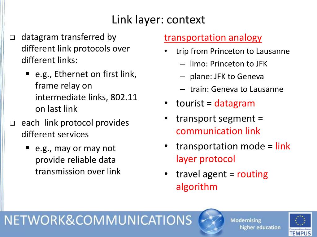 Link layer: context • datagram transferred by different link protocols over different links: • e.g., Ethernet on first link, frame relay on intermediate links, 802.11 on last link • each link protocol provides different services • e.g., may or may not provide reliable data transmission over link transportation analogy • trip from Princeton to Lausanne • limo: Princeton to JFK • plane: JFK to Geneva • train: Geneva to Lausanne • tourist = datagram • transport segment = communication link • transportation mode = link layer protocol • travel agent = routing algorithm