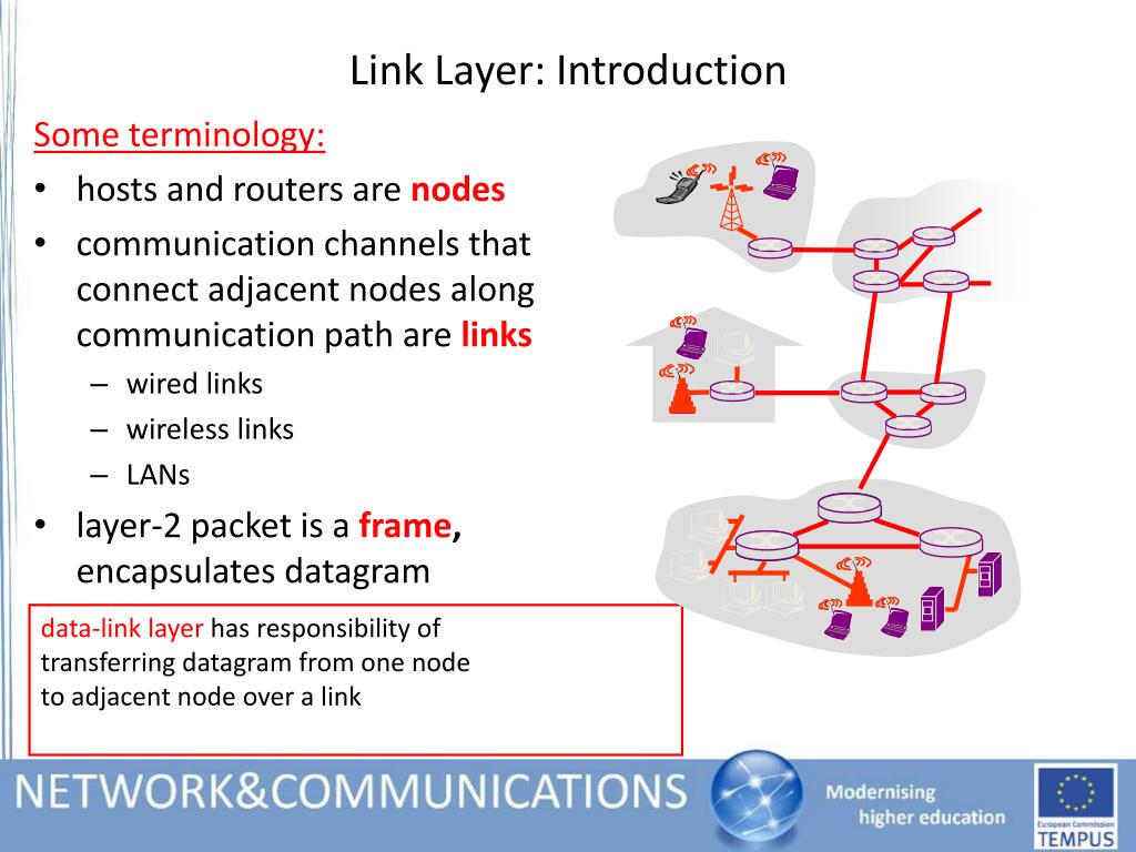 Link Layer: Introduction Some terminology: • hosts and routers are nodes • communication channels that connect adjacent nodes along communication path are links • wired links • wireless links • LANs • layer-2 packet is a frame,encapsulates datagram data-link layer has responsibility of transferring datagram from one node to adjacent node over a link