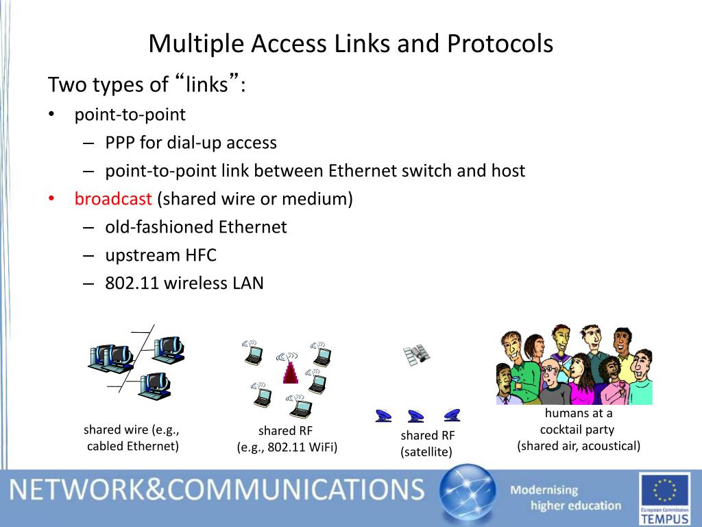 Multiple Access Links and Protocols Two types of “links”: • point-to-point • PPP for dial-up access • point-to-point link between Ethernet switch and host • broadcast (shared wire or medium) • old-fashioned Ethernet • upstream HFC • 802.11 wireless LAN humans at a cocktail party (shared air, acoustical) shared wire (e.g., cabled Ethernet) shared RF (e.g., 802.11 WiFi) shared RF (satellite)