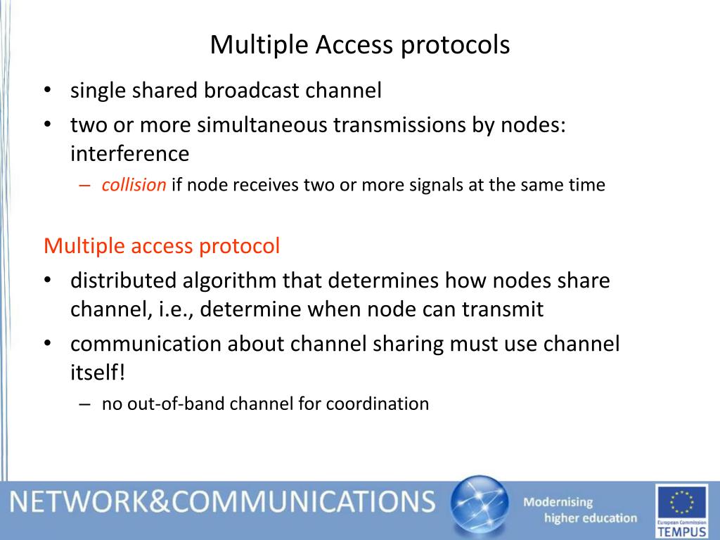 Multiple Access protocols • single shared broadcast channel • two or more simultaneous transmissions by nodes: interference • collision if node receives two or more signals at the same time Multiple access protocol • distributed algorithm that determines how nodes share channel, i.e., determine when node can transmit • communication about channel sharing must use channel itself! • no out-of-band channel for coordination