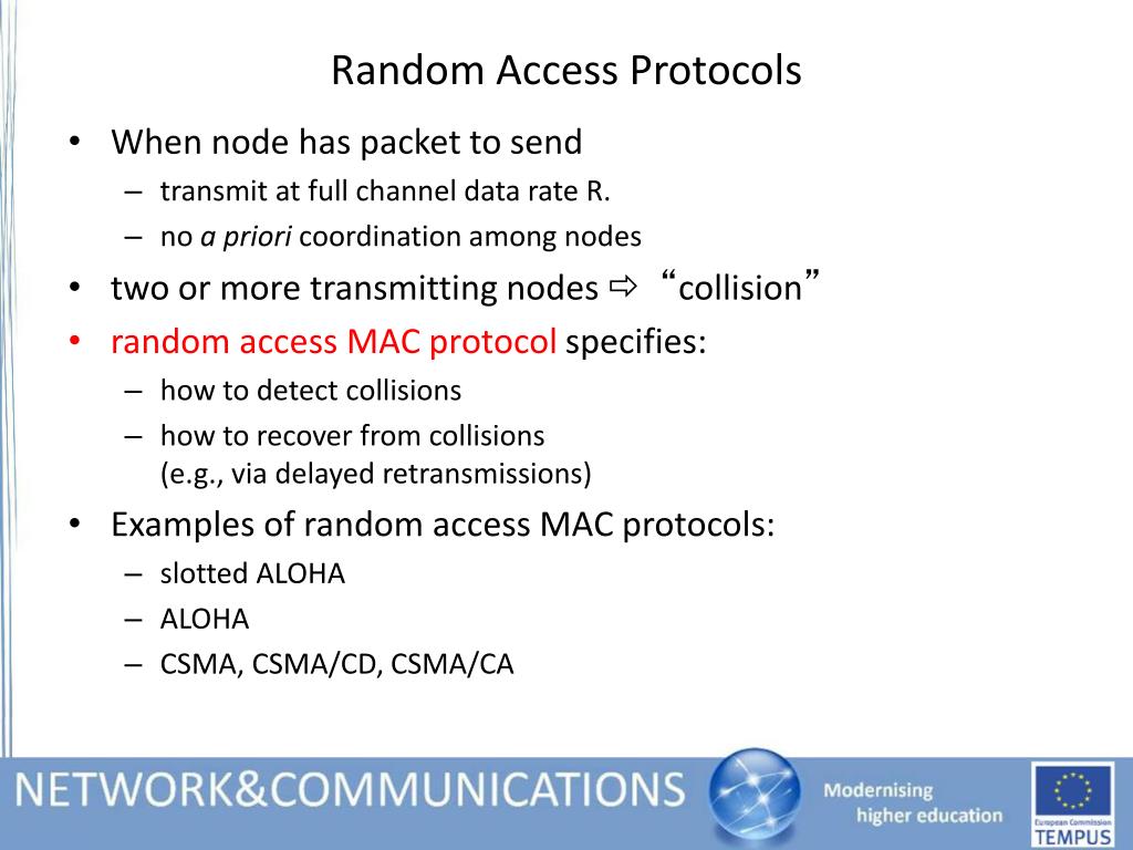 Random Access Protocols • When node has packet to send • transmit at full channel data rate R. • no a priori coordination among nodes • two or more transmitting nodes “collision” • random access MAC protocol specifies: • how to detect collisions • how to recover from collisions (e.g., via delayed retransmissions) • Examples of random access MAC protocols: • slotted ALOHA • ALOHA • CSMA, CSMA/CD, CSMA/CA