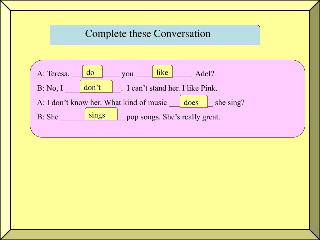 Complete these Conversation A: Teresa, ____________ you ______________ Adel? B: No, I ______________. I can’t stand her. I like Pink. A: I don’t know her. What kind of music ___________ she sing? B: She ________________ pop songs. She’s really great. do like don’t does sings
