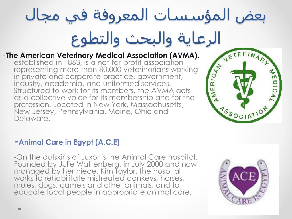 بعض المؤسسات المعروفة في مجال الرعاية والبحث والتطوع -The American Veterinary Medical Association (AVMA), established in 1863, is a not-for-profit association representing more than 80,000 veterinarians working in private and corporate practice, government, industry, academia, and uniformed services. Structured to work for its members, the AVMA acts as a collective voice for its membership and for the profession. Located in New York, Massachusetts, New Jersey, Pennsylvania, Maine, Ohio and Delaware. -Animal Care in Egypt (A.C.E)-On the outskirts of Luxor is the Animal Care hospital. Founded by Julie Wattenberg, in July 2000 and now managed by her niece, Kim Taylor, the hospital works to rehabilitate mistreated donkeys, horses, mules, dogs, camels and other animals; and to educate local people in appropriate animal care.