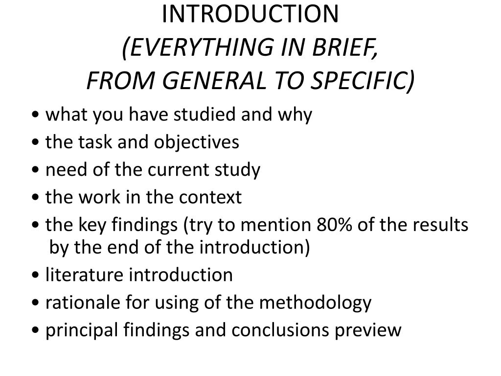 INTRODUCTION(EVERYTHING IN BRIEF, FROM GENERAL TO SPECIFIC) • what you have studied and why • the task and objectives • need of the current study • the work in the context • the key findings (try to mention 80% of the results by the end of the introduction) • literature introduction • rationale for using of the methodology • principal findings and conclusions preview