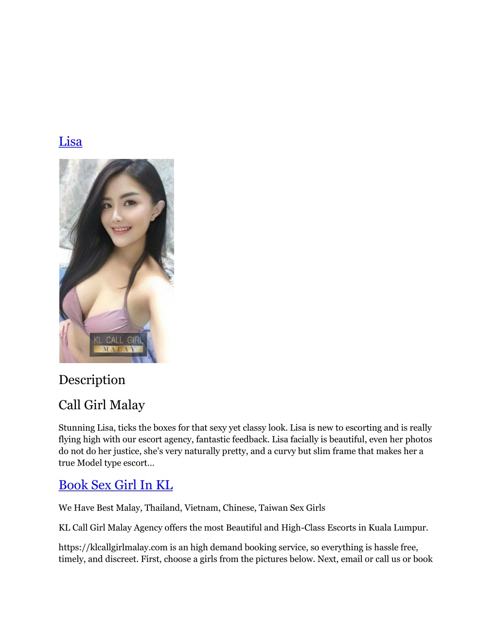 Lisa Description Call Girl Malay Stunning Lisa, ticks the boxes for that sexy yet classy look. Lisa is new to escorting and is really flying high with our escort agency, fantastic feedback. Lisa facially is beautiful, even her photos do not do her justice, she’s very naturally pretty, and a curvy but slim frame that makes her a true Model type escort… Book Sex Girl In KL We Have Best Malay, Thailand, Vietnam, Chinese, Taiwan Sex Girls KL Call Girl Malay Agency offers the most Beautiful and High-Class Escorts in Kuala Lumpur. https://klcallgirlmalay.com is an high demand booking service, so everything is hassle free, timely, and discreet. First, choose a girls from the pictures below. Next, email or call us or book