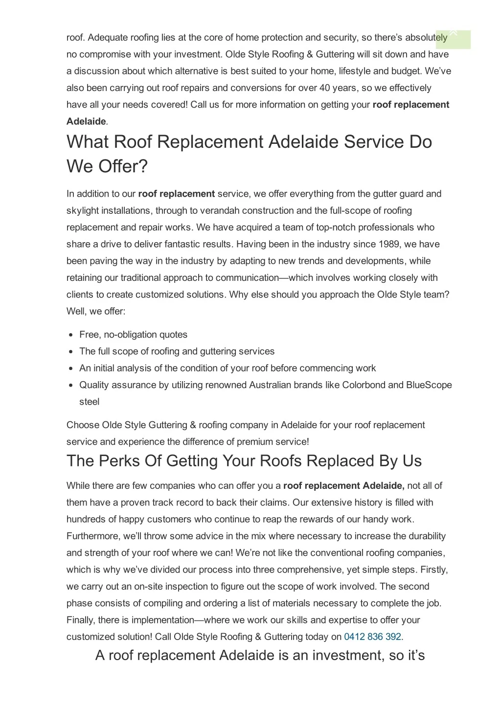 roof. Adequate roofing lies at the core of home protection and security, so there’s absolutely no compromise with your investment. Olde Style Roofing & Guttering will sit down and have a discussion about which alternative is best suited to your home, lifestyle and budget. We’ve also been carrying out roof repairs and conversions for over 40 years, so we effectively have all your needs covered! Call us for more information on getting your roof replacement Adelaide. What Roof Replacement Adelaide Service Do We Offer? In addition to our roof replacement service, we offer everything from the gutter guard and skylight installations, through to verandah construction and the fullscope of roofing replacement and repair works. We have acquired a team of topnotch professionals who share a drive to deliver fantastic results. Having been in the industry since 1989, we have been paving the way in the industry by adapting to new trends and developments, while retaining our traditional approach to communication—which involves working closely with clients to create customized solutions. Why else should you approach the Olde Style team? Well, we offer: Free, noobligation quotes The full scope of roofing and guttering services An initial analysis of the condition of your roof before commencing work Quality assurance by utilizing renowned Australian brands like Colorbond and BlueScope steel Choose Olde Style Guttering & roofing company in Adelaide for your roof replacement service and experience the difference of premium service! The Perks Of Getting Your Roofs Replaced By Us While there are few companies who can offer you a roof replacement Adelaide, not all of them have a proven track record to back their claims. Our extensive history is filled with hundreds of happy customers who continue to reap the rewards of our handy work. Furthermore, we’ll throw some advice in the mix where necessary to increase the durability and strength of your roof where we can! We’re not like the conventional roofing companies, which is why we’ve divided our process into three comprehensive, yet simple steps. Firstly, we carry out an onsite inspection to figure out the scope of work involved. The second phase consists of compiling and ordering a list of materials necessary to complete the job. Finally, there is implementation—where we work our skills and expertise to offer your customized solution! Call Olde Style Roofing & Guttering today on 0412 836 392. A roof replacement Adelaide is an investment, so it’s