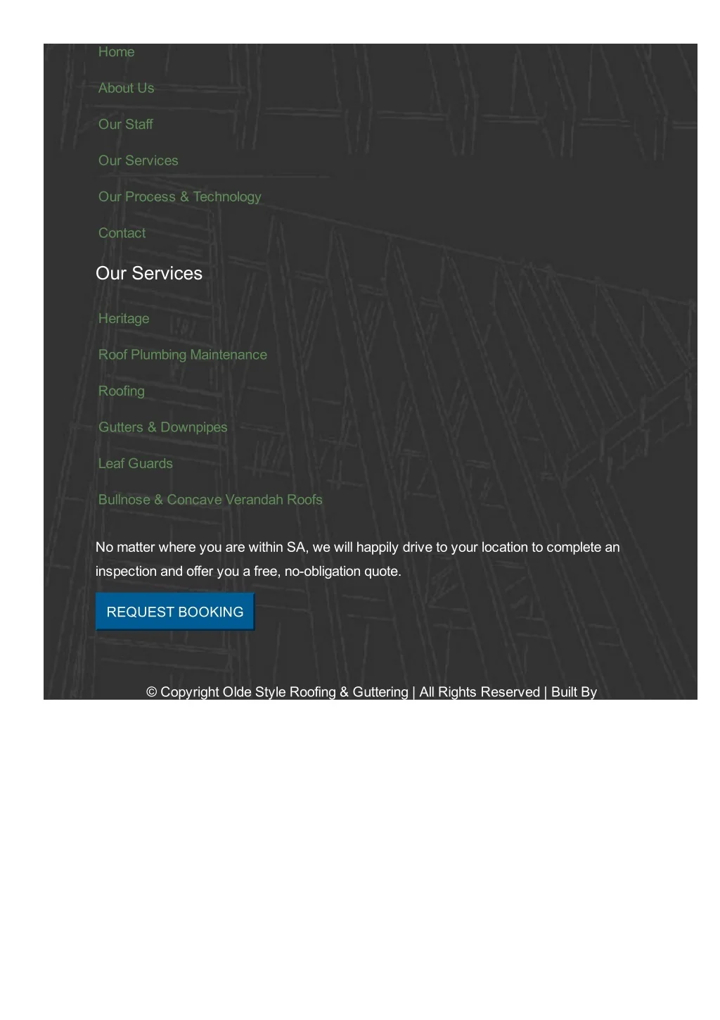 Home About Us Our Staff Our Services Our Process & Technology Contact Our Services Heritage Roof Plumbing Maintenance Roofing Gutters & Downpipes Leaf Guards Bullnose & Concave Verandah Roofs No matter where you are within SA, we will happily drive to your location to complete an inspection and offer you a free, noobligation quote. REQUEST BOOKING © Copyright Olde Style Roofing & Guttering | All Rights Reserved | Built By
