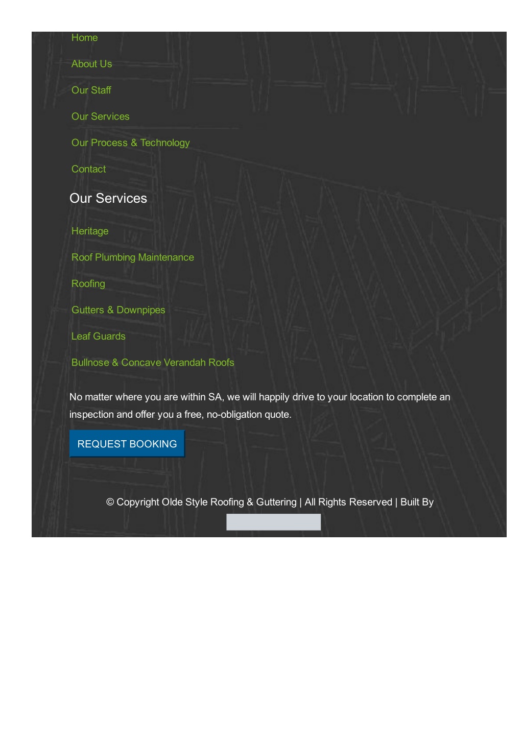 Home About Us Our Staff Our Services Our Process & Technology Contact Our Services Heritage Roof Plumbing Maintenance Roofing Gutters & Downpipes Leaf Guards Bullnose & Concave Verandah Roofs No matter where you are within SA, we will happily drive to your location to complete an inspection and offer you a free, noobligation quote. REQUEST BOOKING © Copyright Olde Style Roofing & Guttering | All Rights Reserved | Built By