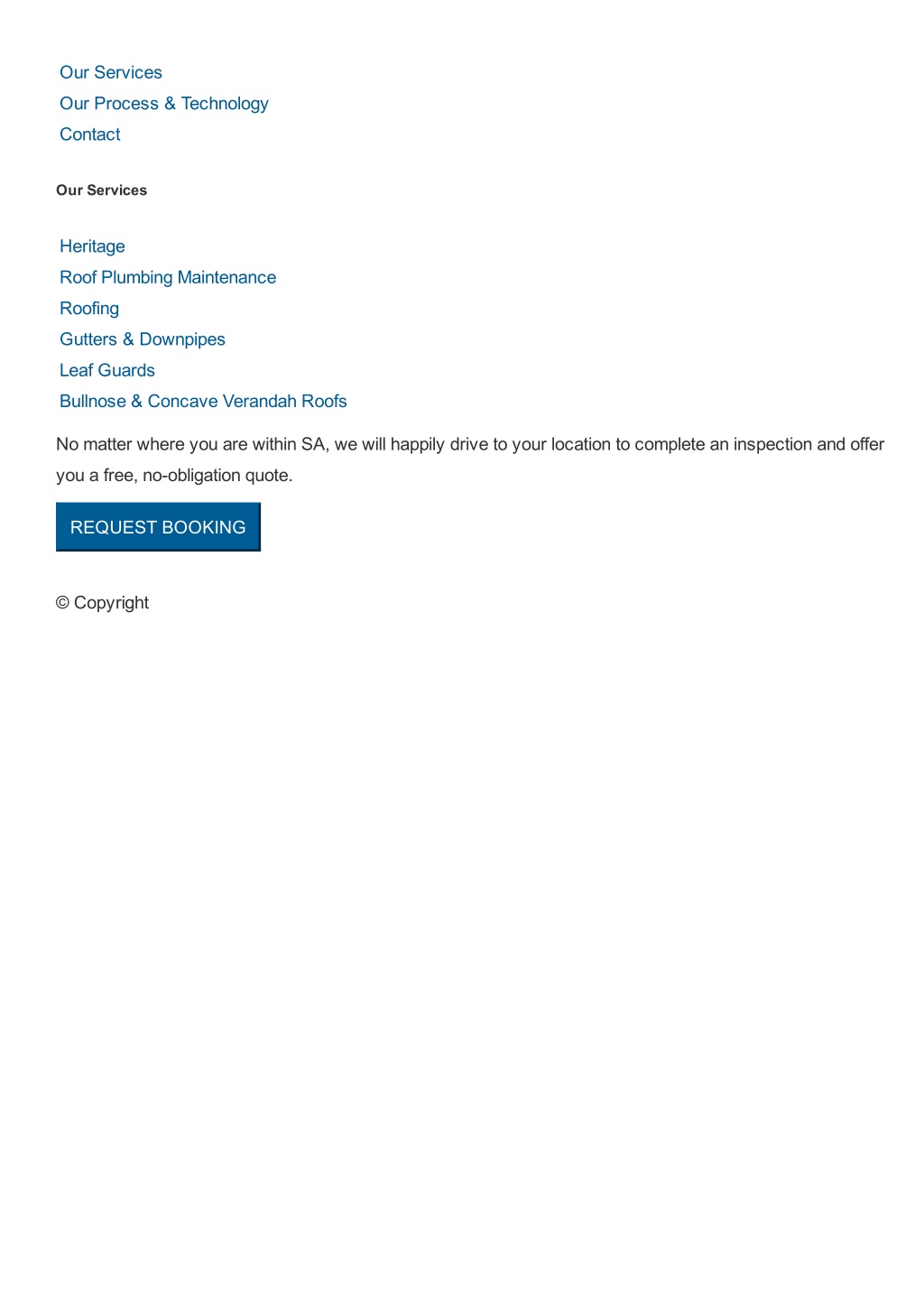 Our Services Our Process & Technology Contact Our Services Heritage Roof Plumbing Maintenance Roofing Gutters & Downpipes Leaf Guards Bullnose & Concave Verandah Roofs No matter where you are within SA, we will happily drive to your location to complete an inspection and offer you a free, noobligation quote. REQUEST BOOKING © Copyright