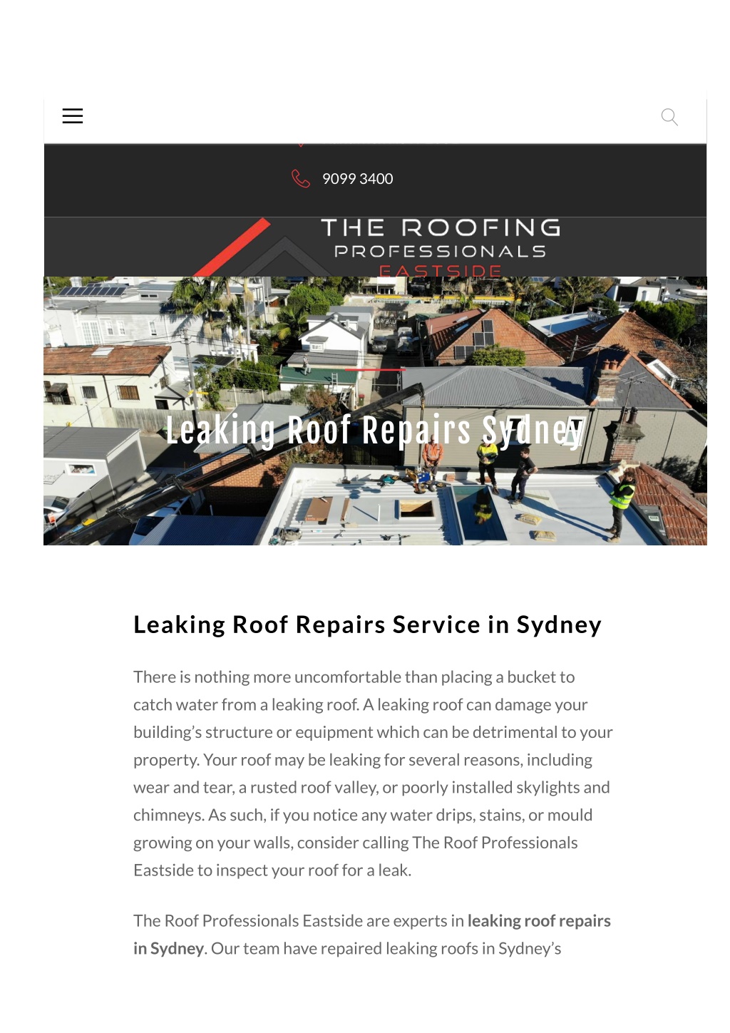 Randwick NSW 2031 9099 3400 Leaking Roof Repairs Sydney Leaking Roof Repairs Service in Sydney There is nothing more uncomfortable than placing a bucket to catch water from a leaking roof. A leaking roof can damage your building’s structure or equipment which can be detrimental to your property. Your roof may be leaking for several reasons, including wear and tear, a rusted roof valley, or poorly installed skylights and chimneys. As such, if you notice any water drips, stains, or mould growing on your walls, consider calling The Roof Professionals Eastside to inspect your roof for a leak. The Roof Professionals Eastside are experts in leaking roof repairs in Sydney. Our team have repaired leaking roofs in Sydney’s