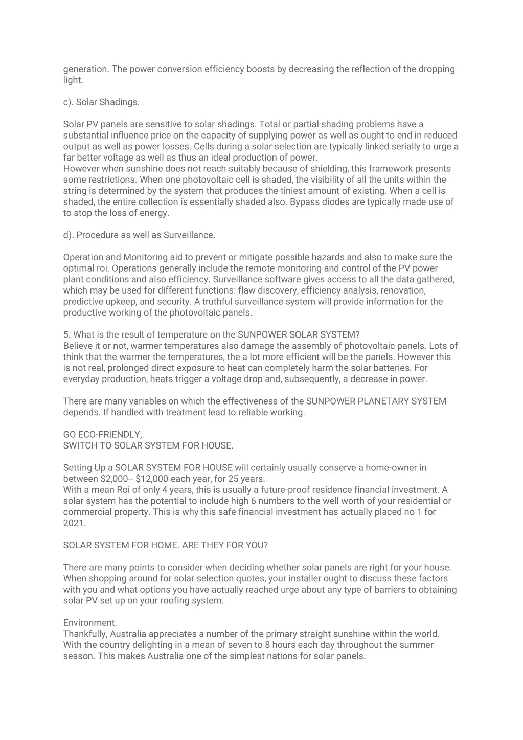 generation. The power conversion efficiency boosts by decreasing the reflection of the dropping light. c). Solar Shadings. Solar PV panels are sensitive to solar shadings. Total or partial shading problems have a substantial influence price on the capacity of supplying power as well as ought to end in reduced output as well as power losses. Cells during a solar selection are typically linked serially to urge a far better voltage as well as thus an ideal production of power. However when sunshine does not reach suitably because of shielding, this framework presents some restrictions. When one photovoltaic cell is shaded, the visibility of all the units within the string is determined by the system that produces the tiniest amount of existing. When a cell is shaded, the entire collection is essentially shaded also. Bypass diodes are typically made use of to stop the loss of energy. d). Procedure as well as Surveillance. Operation and Monitoring aid to prevent or mitigate possible hazards and also to make sure the optimal roi. Operations generally include the remote monitoring and control of the PV power plant conditions and also efficiency. Surveillance software gives access to all the data gathered, which may be used for different functions: flaw discovery, efficiency analysis, renovation, predictive upkeep, and security. A truthful surveillance system will provide information for the productive working of the photovoltaic panels. 5. What is the result of temperature on the SUNPOWER SOLAR SYSTEM? Believe it or not, warmer temperatures also damage the assembly of photovoltaic panels. Lots of think that the warmer the temperatures, the a lot more efficient will be the panels. However this is not real, prolonged direct exposure to heat can completely harm the solar batteries. For everyday production, heats trigger a voltage drop and, subsequently, a decrease in power. There are many variables on which the effectiveness of the SUNPOWER PLANETARY SYSTEM depends. If handled with treatment lead to reliable working. GO ECO-FRIENDLY,. SWITCH TO SOLAR SYSTEM FOR HOUSE. Setting Up a SOLAR SYSTEM FOR HOUSE will certainly usually conserve a home-owner in between $2,000-- $12,000 each year, for 25 years. With a mean Roi of only 4 years, this is usually a future-proof residence financial investment. A solar system has the potential to include high 6 numbers to the well worth of your residential or commercial property. This is why this safe financial investment has actually placed no 1 for 2021. SOLAR SYSTEM FOR HOME. ARE THEY FOR YOU? There are many points to consider when deciding whether solar panels are right for your house. When shopping around for solar selection quotes, your installer ought to discuss these factors with you and what options you have actually reached urge about any type of barriers to obtaining solar PV set up on your roofing system. Environment. Thankfully, Australia appreciates a number of the primary straight sunshine within the world. With the country delighting in a mean of seven to 8 hours each day throughout the summer season. This makes Australia one of the simplest nations for solar panels.
