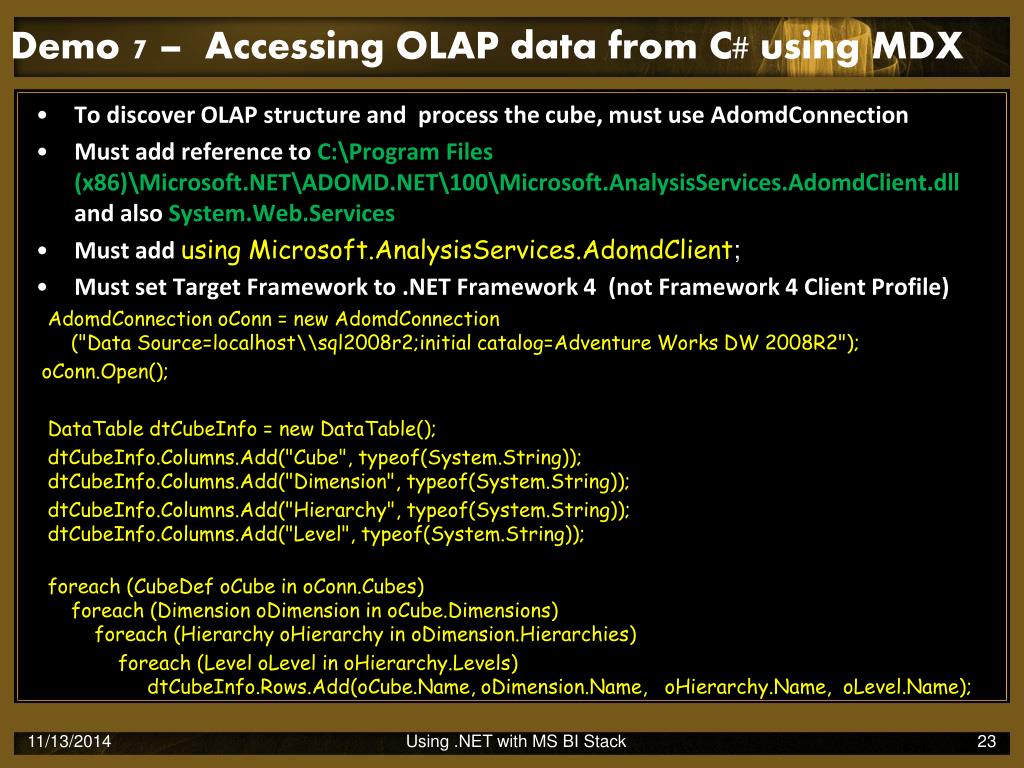 Demo 7 – Accessing OLAP data from C# using MDX • To discover OLAP structure and process the cube, must use AdomdConnection • Must add reference to C:\Program Files (x86)\Microsoft.NET\ADOMD.NET\100\Microsoft.AnalysisServices.AdomdClient.dll and also System.Web.Services • Must add using Microsoft.AnalysisServices.AdomdClient; • Must set Target Framework to .NET Framework 4 (not Framework 4 Client Profile) AdomdConnectionoConn= new AdomdConnection ("Data Source=localhost\\sql2008r2;initial catalog=Adventure Works DW 2008R2"); oConn.Open(); DataTabledtCubeInfo = new DataTable(); dtCubeInfo.Columns.Add("Cube", typeof(System.String));dtCubeInfo.Columns.Add("Dimension", typeof(System.String)); dtCubeInfo.Columns.Add("Hierarchy", typeof(System.String));dtCubeInfo.Columns.Add("Level", typeof(System.String)); foreach(CubeDefoCube in oConn.Cubes)foreach (Dimension oDimension in oCube.Dimensions)foreach (Hierarchy oHierarchy in oDimension.Hierarchies) foreach (Level oLevel in oHierarchy.Levels)dtCubeInfo.Rows.Add(oCube.Name, oDimension.Name, oHierarchy.Name, oLevel.Name); Using .NET with MS BI Stack