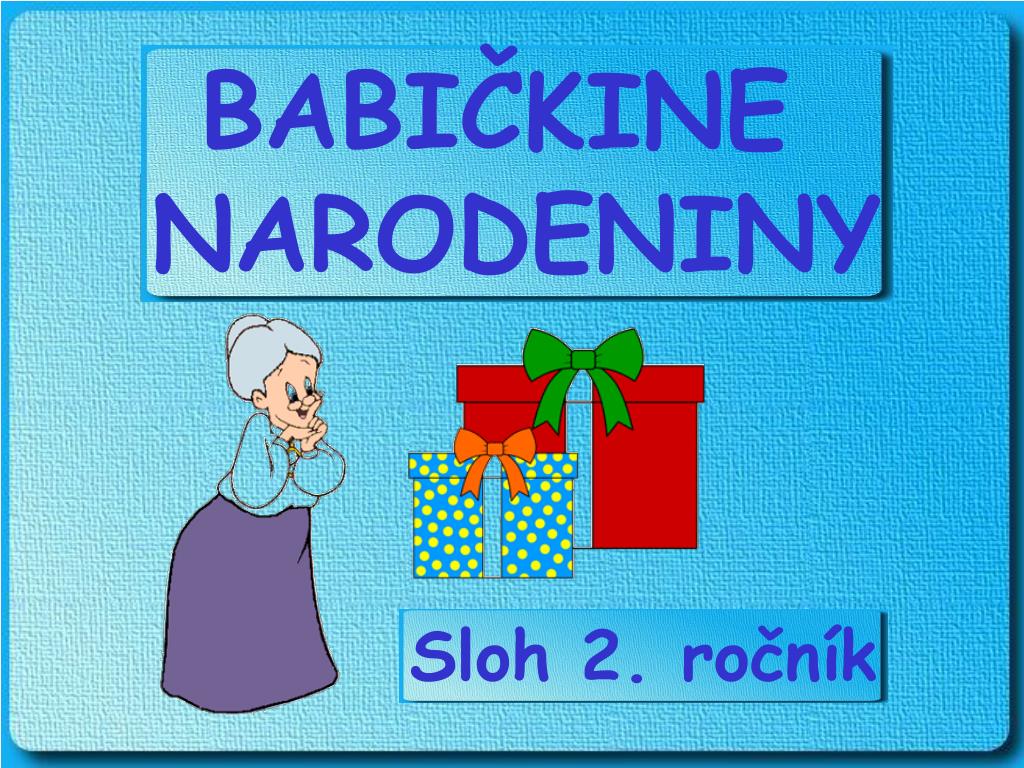 BABIČKINE NARODENINY. Sloh 2. ročník. Naša. Elenka bude mať v sobotu narodeniny. Má už 57 rokov. Veľmi sa teším, lebo k nám prídu hostia a mamička Evička pripraví hostinu. Chce upiecť veľkú. a pre deti vraj chystá. Na. prekvapenie. Mne sa zdá, že to bude.