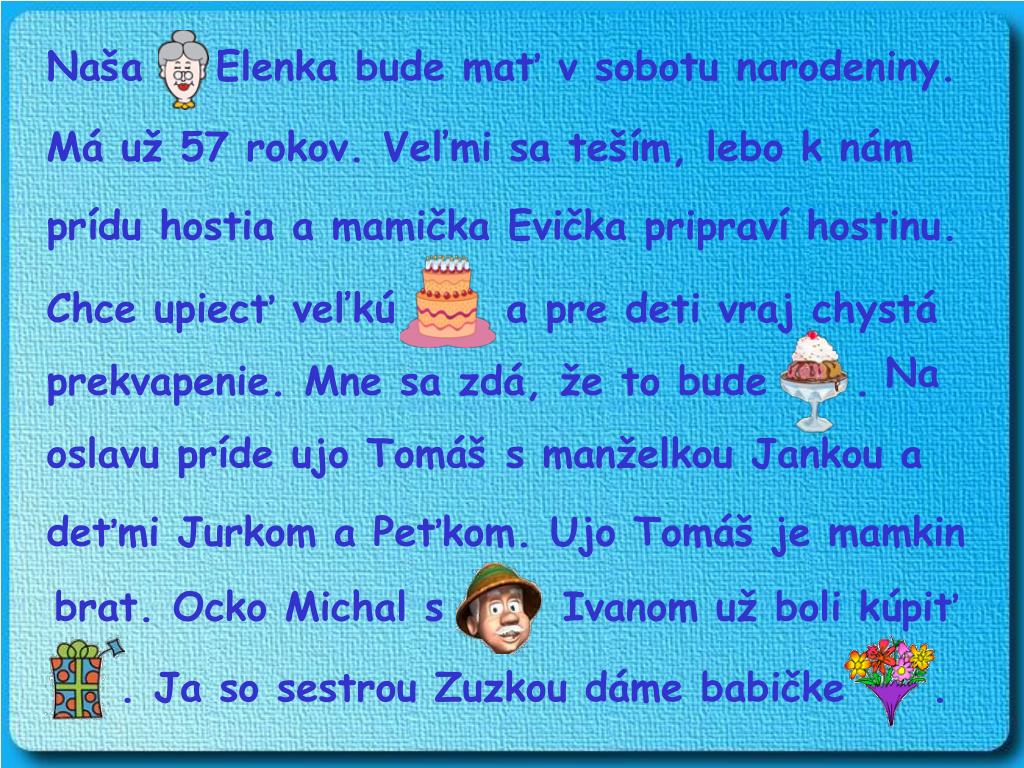 Naša Elenka bude mať v sobotu narodeniny. Má už 57 rokov. Veľmi sa teším, lebo k nám prídu hostia a mamička Evička pripraví hostinu. Chce upiecť veľkú a pre deti vraj chystá Na prekvapenie. Mne sa zdá, že to bude . oslavu príde ujo Tomáš s manželkou Jankou a deťmi Jurkom a Peťkom. Ujo Tomáš je mamkin brat. Ocko Michal s Ivanom už boli kúpiť . Ja so sestrou Zuzkou dáme babičke .