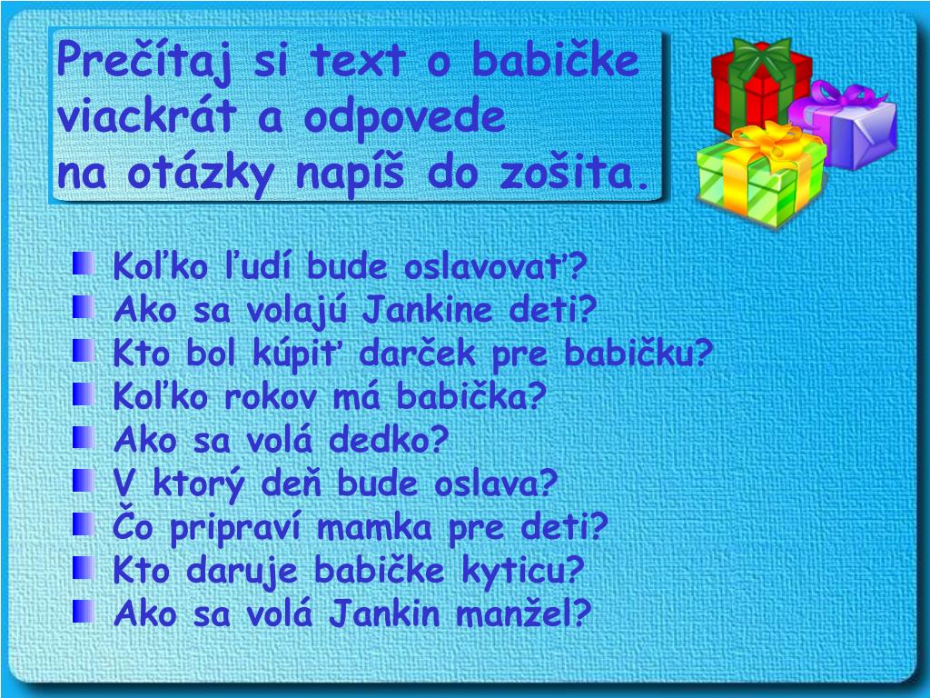Prečítaj si text o babičke viackrát a odpovede na otázky napíš do zošita. • Koľko ľudí bude oslavovať? • Ako sa volajú Jankine deti? • Kto bol kúpiť darček pre babičku? • Koľko rokov má babička? • Ako sa volá dedko? • V ktorý deň bude oslava? • Čo pripraví mamka pre deti? • Kto daruje babičke kyticu? • Ako sa volá Jankin manžel?