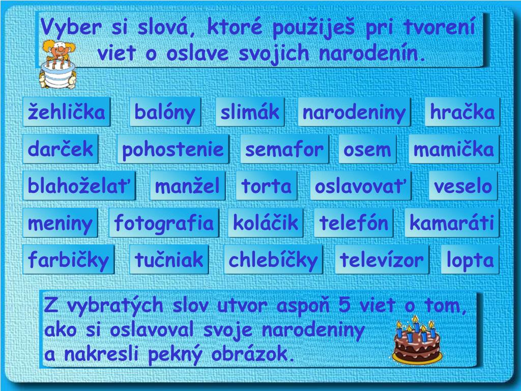 Vyber si slová, ktoré použiješ pri tvorení viet o oslave svojich narodenín. žehlička balóny slimák narodeniny hračka darček pohostenie semafor osem mamička blahoželať manžel torta oslavovať veselo meniny fotografia koláčik telefón kamaráti farbičky tučniak chlebíčky televízor lopta Z vybratých slov utvor aspoň 5 viet o tom, ako si oslavoval svoje narodeniny a nakresli pekný obrázok.