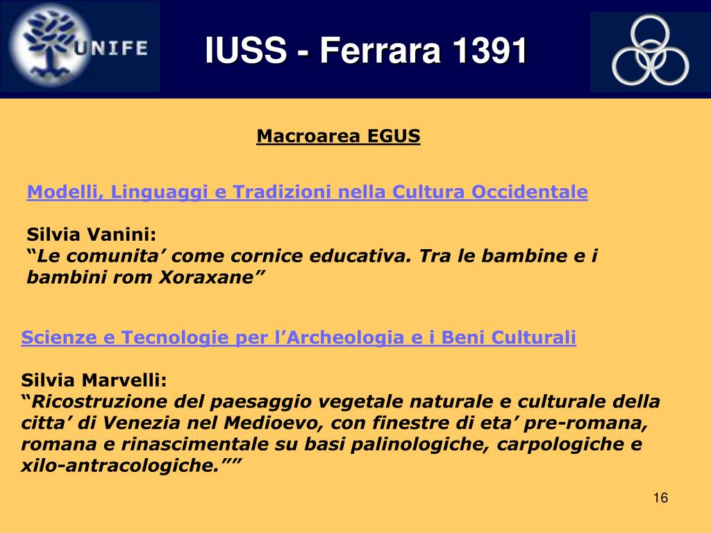 IUSS - Ferrara 1391 Macroarea EGUS Modelli, Linguaggi e Tradizioni nella Cultura Occidentale Silvia Vanini: “Le comunita’ come cornice educativa. Tra le bambine e i bambini rom Xoraxane” Scienze e Tecnologie per l’Archeologia e i Beni Culturali Silvia Marvelli: “Ricostruzione del paesaggio vegetale naturale e culturale della citta’ di Venezia nel Medioevo, con finestre di eta’ pre-romana, romana e rinascimentale su basi palinologiche, carpologiche e xilo-antracologiche.””