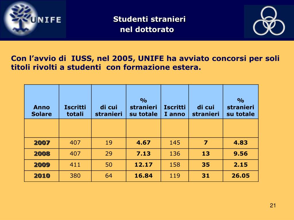 Studenti stranieri nel dottorato Con l’avvio di IUSS, nel 2005, UNIFE ha avviato concorsi per soli titoli rivolti a studenti con formazione estera.