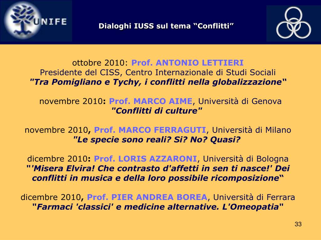 Dialoghi IUSS sul tema “Conflitti” ottobre 2010: Prof. ANTONIO LETTIERI Presidente del CISS, Centro Internazionale di Studi Sociali "Tra Pomigliano e Tychy, i conflitti nella globalizzazione“ novembre 2010: Prof. MARCO AIME, Università di Genova "Conflitti di culture" novembre 2010, Prof. MARCO FERRAGUTI, Università di Milano "Le specie sono reali? Si? No? Quasi? dicembre 2010: Prof. LORIS AZZARONI, Università di Bologna "'Misera Elvira! Che contrasto d'affetti in sen ti nasce!' Dei conflitti in musica e della loro possibile ricomposizione“ dicembre 2010, Prof. PIER ANDREA BOREA, Università di Ferrara "Farmaci 'classici' e medicine alternative. L'Omeopatia"