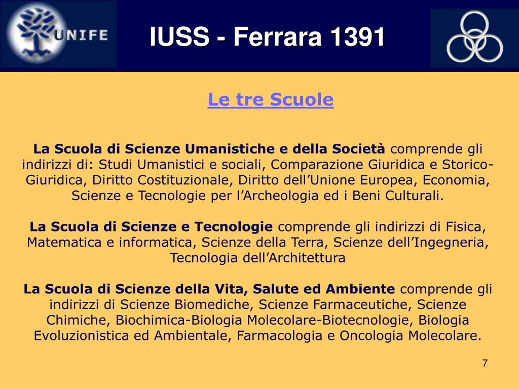 IUSS - Ferrara 1391 Le tre Scuole La Scuola di Scienze Umanistiche e della Società comprende gli indirizzi di: Studi Umanistici e sociali, Comparazione Giuridica e Storico-Giuridica, Diritto Costituzionale, Diritto dell’Unione Europea, Economia, Scienze e Tecnologie per l’Archeologia ed i Beni Culturali. La Scuola di Scienze e Tecnologie comprende gli indirizzi di Fisica, Matematica e informatica, Scienze della Terra, Scienze dell’Ingegneria, Tecnologia dell’Architettura La Scuola di Scienze della Vita, Salute ed Ambiente comprende gli indirizzi di Scienze Biomediche, Scienze Farmaceutiche, Scienze Chimiche, Biochimica-Biologia Molecolare-Biotecnologie, Biologia Evoluzionistica ed Ambientale, Farmacologia e Oncologia Molecolare.