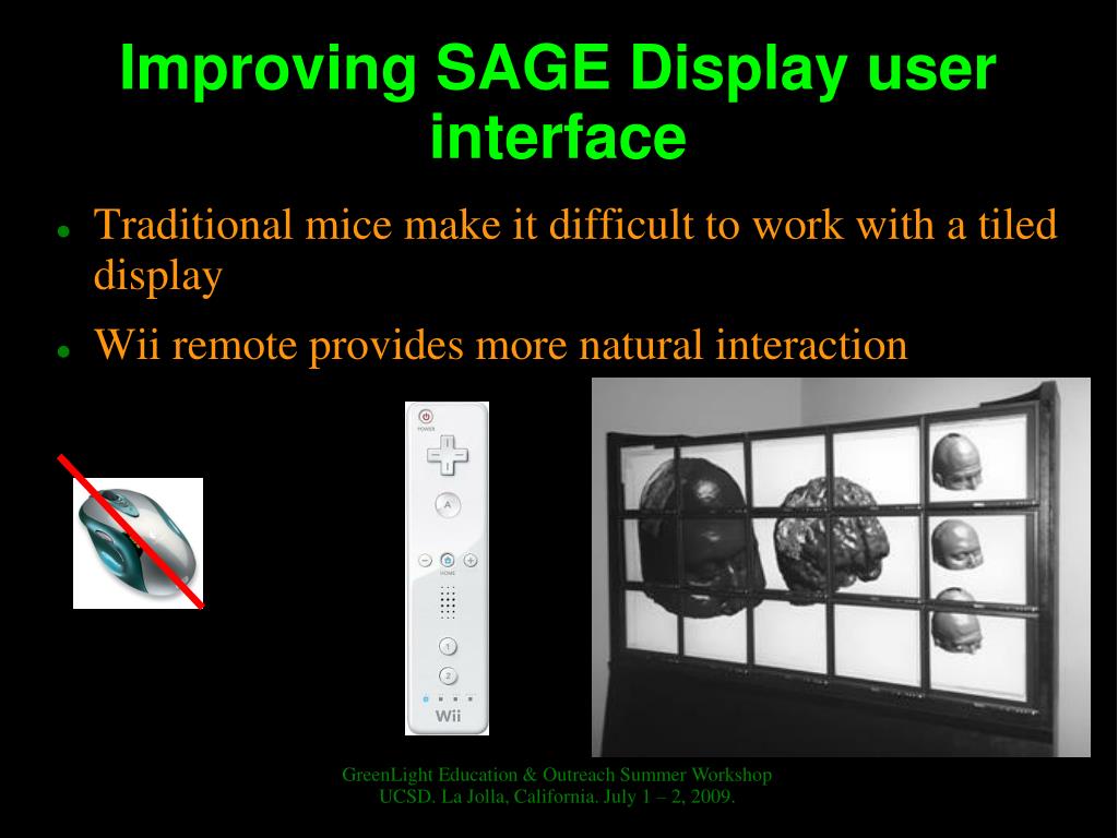 GreenLight Education & Outreach Summer Workshop UCSD. La Jolla, California. July 1 – 2, 2009. Improving SAGE Display user interface • Traditional mice make it difficult to work with a tiled display • Wii remote provides more natural interaction