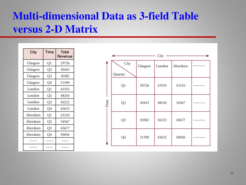 Multi-dimensional Data and OLAP cubes • Multi-dimensional data is facts (numeric measurements) such as property sales revenue data and the association of this data with dimensions such as location (of the property) and time (of the property sale). • Which is the best representation of multi-dimensional data: relational table, matrix or data cube?