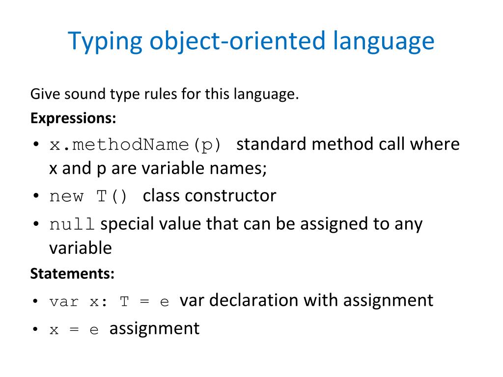Typingobject-orientedlanguage Givesound type rules for thislanguage. Expressions: • x.methodName(p) standard method callwhere x and p are variable names; • new T() class constructor • nullspecial value that can be assigned to any variable Statements: • var x: T = e var declarationwithassignment • x = e assignment