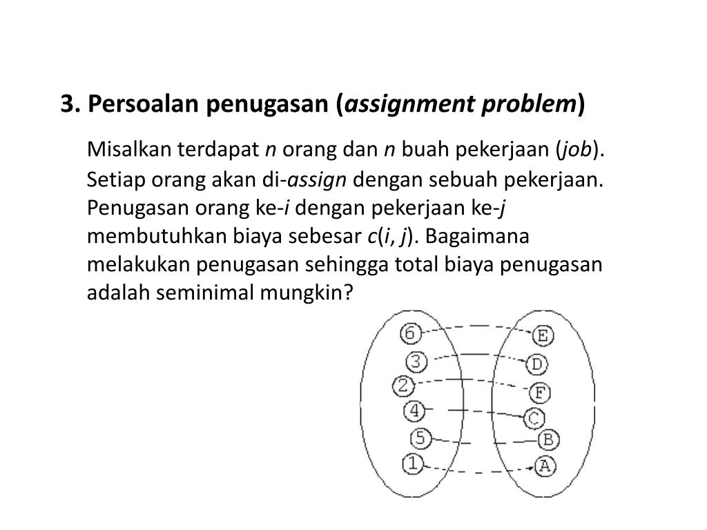 3. Persoalan penugasan (assignment problem) Misalkan terdapat n orang dan n buah pekerjaan (job). Setiap orang akan di-assign dengan sebuah pekerjaan. Penugasan orang ke-i dengan pekerjaan ke-j membutuhkan biaya sebesar c(i, j). Bagaimana melakukan penugasan sehingga total biaya penugasan adalah seminimal mungkin?