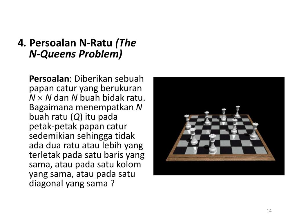 4. Persoalan N-Ratu (The N-Queens Problem) Persoalan: Diberikan sebuah papan catur yang berukuran NN dan N buah bidak ratu. Bagaimana menempatkan N buah ratu (Q) itu pada petak-petak papan catur sedemikian sehingga tidak ada dua ratu atau lebih yang terletak pada satu baris yang sama, atau pada satu kolom yang sama, atau pada satu diagonal yang sama ?
